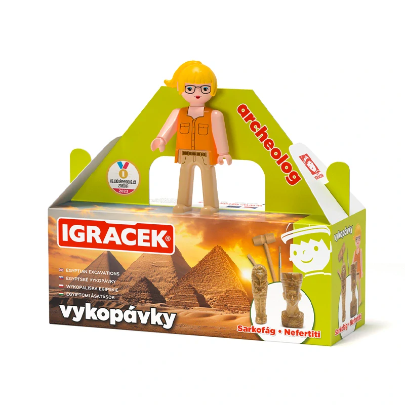 Děti rády objevují. Proto jsme pro ně připravili dobrodružnou řadu Igráčků s vykopávkami. V tomto setu budou děti s Igráčkem Archeoložkou odhalovat egyptské artefakty. Jejich úkolem bude vykopat ze dvou kamenů sarkofág a sošku Nefertiti. Při zábavné činnosti si procvičí jemnou motoriku i trpělivost.