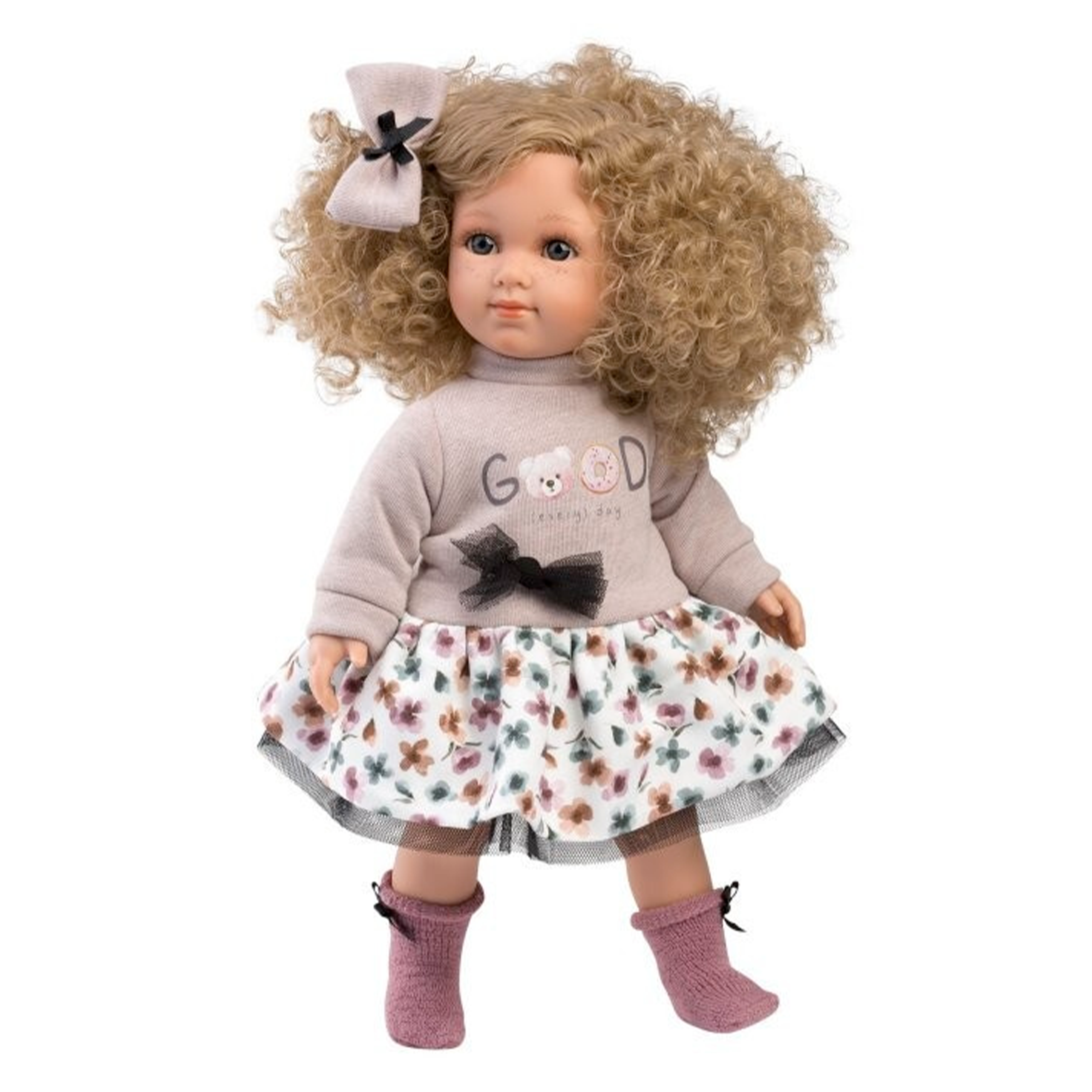 Panenka bez zvuku s látkovým tělem a vlásky porostlými po celé hlavě, podobající se malé slečně. Velikost 35 cm. M. Llorens Juan, Carrer Gabriel Miró 6, 03430 Onil, ES, info@mllorens.es celý popis